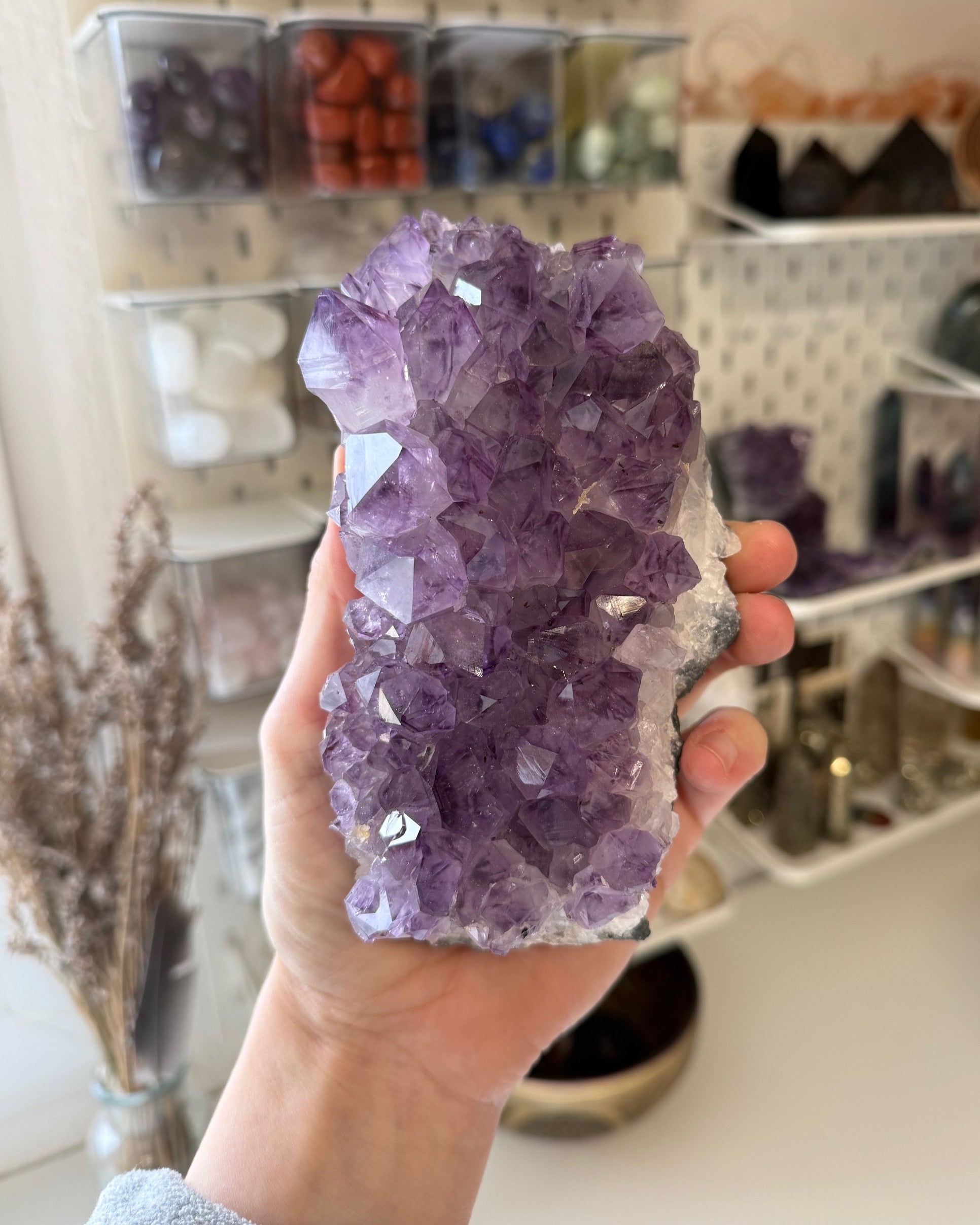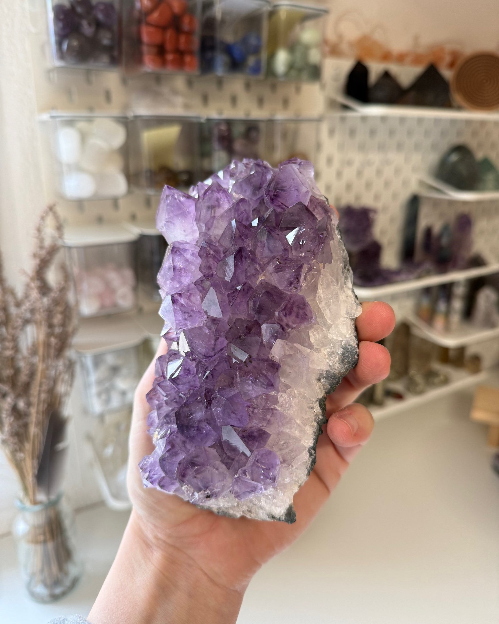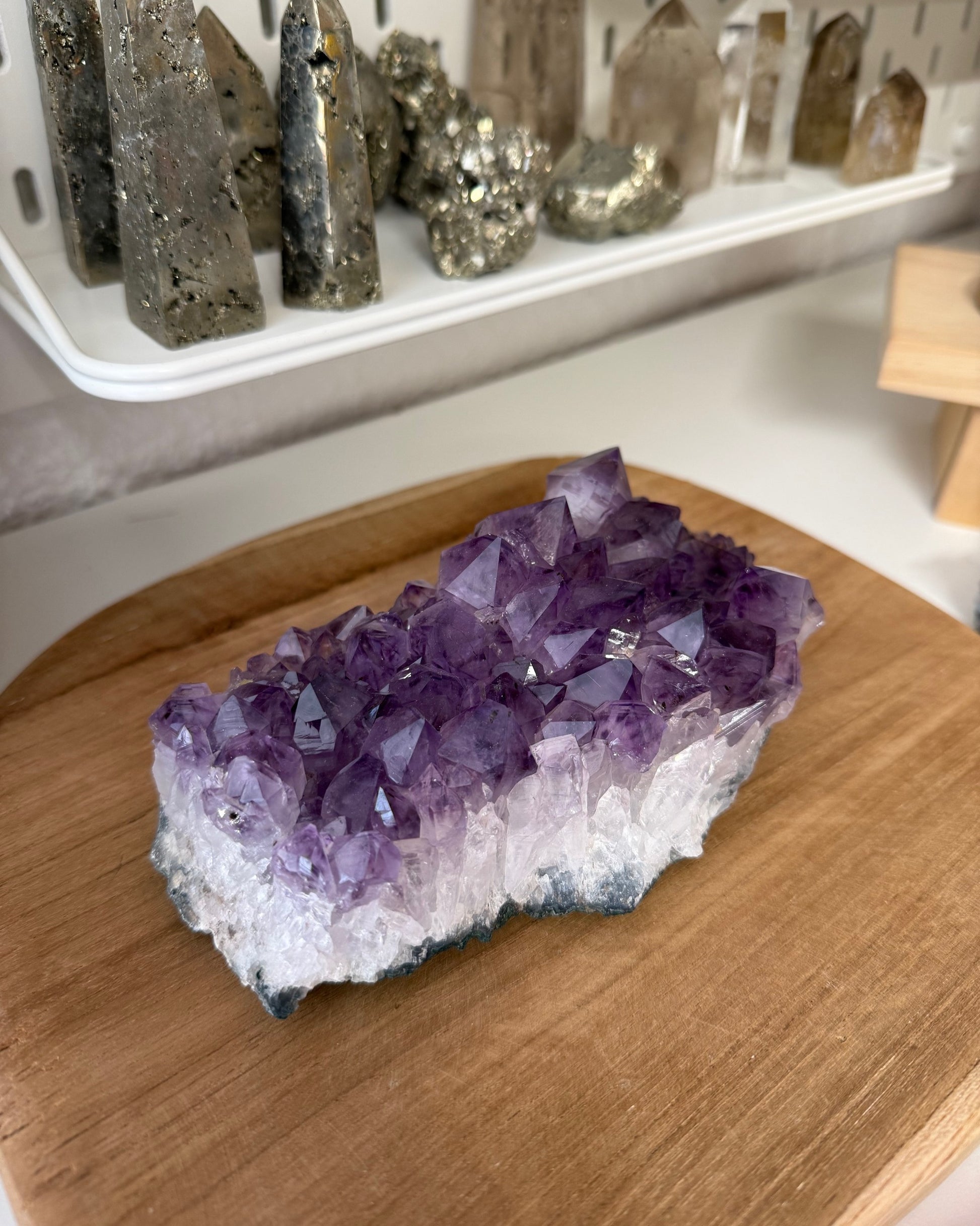 La amatista es una de las piedras más apreciadas por su energía calmante, espiritual y purificadora. En forma de drusa, su vibración se potencia: cada cristalito actúa como un canal de luz que eleva la energía del ambiente, aportando serenidad, protección y armonía.