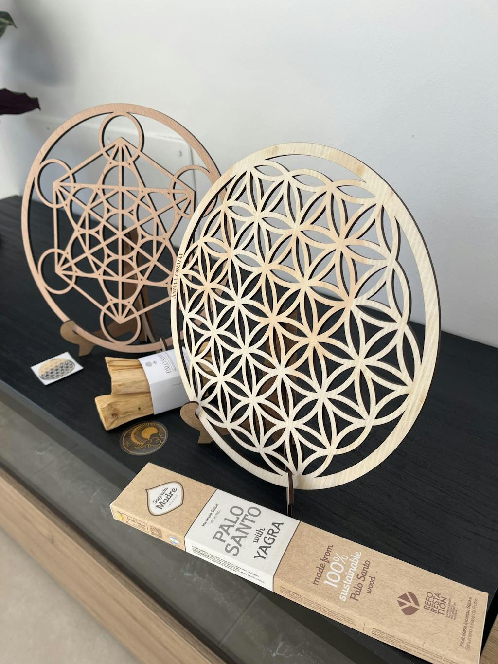 Tres símbolos ancestrales que contienen la armonía del universo, grabados en madera natural y diseñados como piezas rituales, decorativas o energéticas.